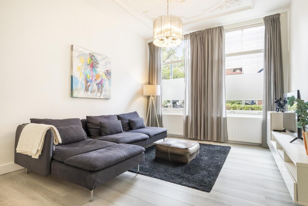 De woonkamer heeft hoge plafonds met sierlijke ornamenten, de grote ramen en de prachtige lichtinval geven de woonkamer een elegante en open sfeer. Hier geniet je van een rustig moment op de bank of een gezellig diner met vrienden in de ruime eetkamer.