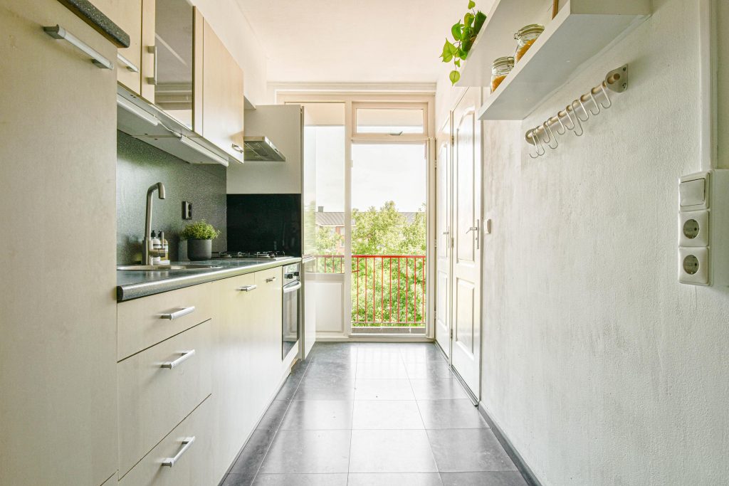 De keuken is praktisch ingericht, met veel opbergruimte en directe toegang tot het balkon. Hier kun je koken met uitzicht op het groen, een ware luxe in Amsterdam. De badkamer is netjes afgewerkt met een ligbad en wastafel, en het separate toilet zorgt voor extra comfort.