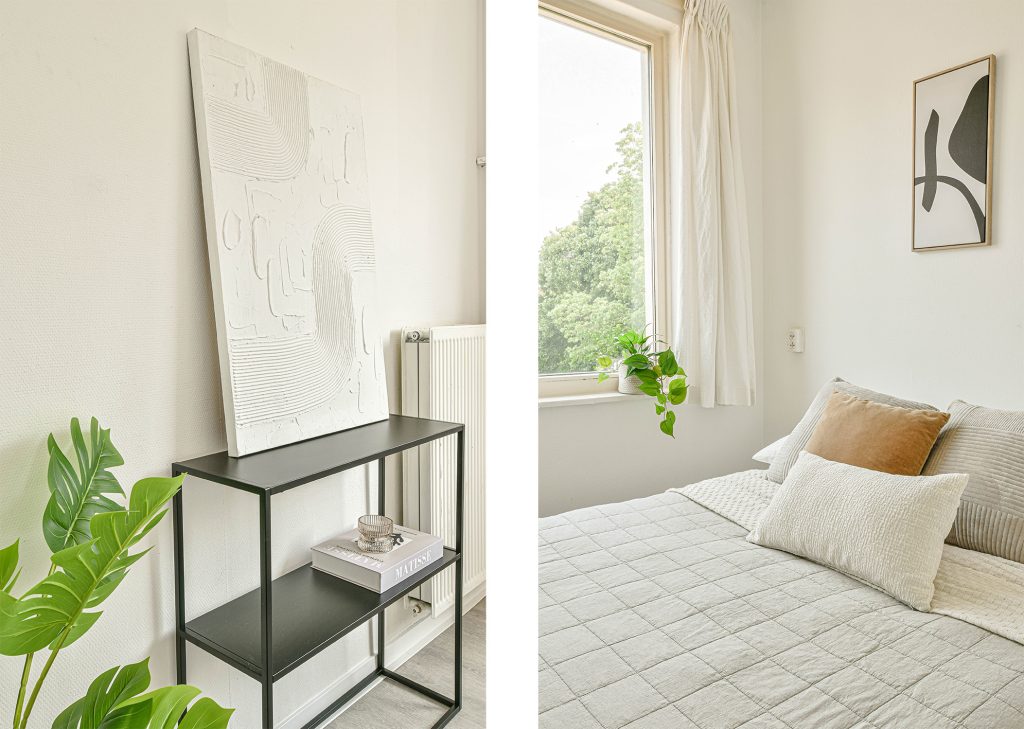 Het appartement beschikt over twee slaapkamers. De hoofdslaapkamer is aan de rustige achterzijde gelegen, met ruimte voor een tweepersoonsbed én een kledingkast. De tweede slaapkamer is momenteel ingericht als werkkamer, ideaal voor wie thuis werkt of studeert – of natuurlijk als extra slaapkamer of logeerkamer.