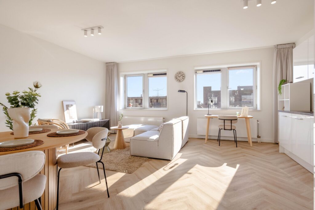 Via het gemeenschappelijke trappenhuis bereik je de woning op de derde verdieping. Je komt binnen in de woonkamer, die toegang geeft tot alle vertrekken. De ruime en lichte woonkamer vormt het hart van de woning en beschikt over grote raampartijen aan de voorzijde, waardoor er volop daglicht binnenvalt en een prettig, open gevoel ontstaat. Hier is voldoende ruimte voor zowel een comfortabele zithoek als eethoek. De open keuken sluit naadloos aan op de woonkamer en is modern uitgevoerd met strakke kasten en diverse inbouwapparatuur zoals een oven, inductie, koelkast, vriezer en afzuigkap. ideaal voor dagelijks gebruik.