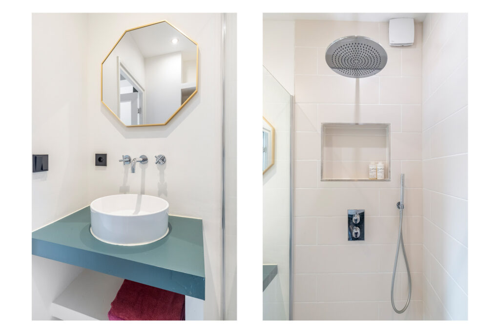 The bathroom is modern and sleek, with a walk-in rain shower and plenty of storage space. A separate toilet is also available. Extra storage is provided by a separate storage unit, ideal for bicycles, luggage, or seasonal items.