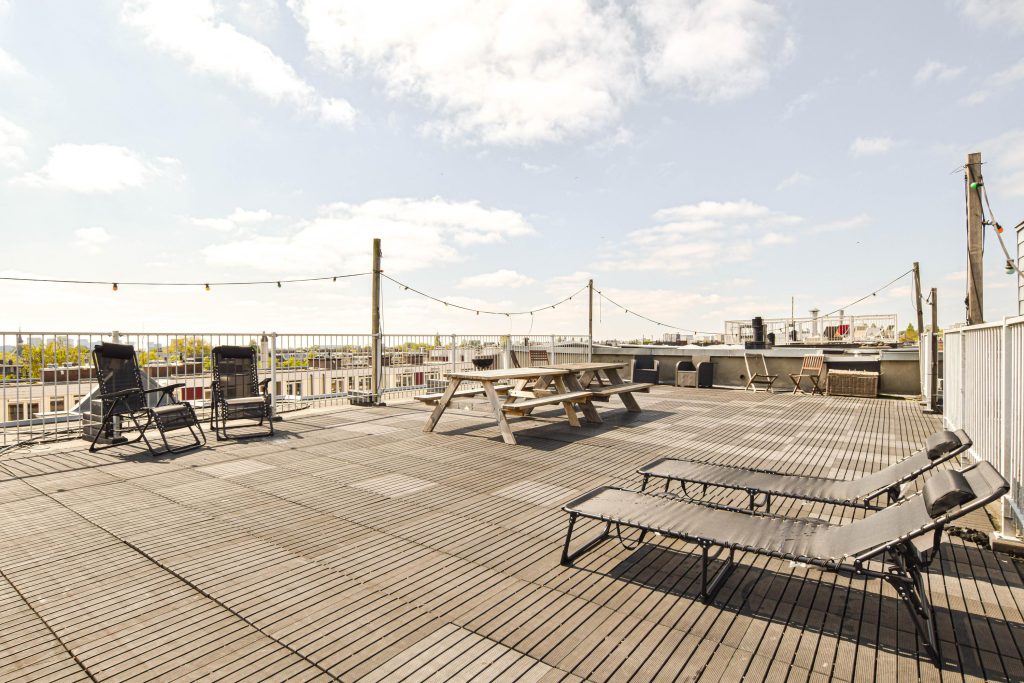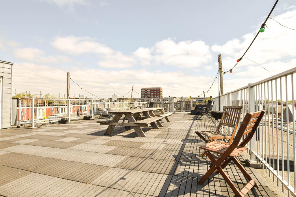 Er is een gezamenlijk dakterras van ca.125m² waarbij je uitzicht hebt over de hele stad. Tijdens oud en nieuw geniet je hier van een met vuurwerk versierd panoramisch uitzicht en in de zomer van een zonovergoten barbecue. Het dakterras wordt netjes onderhouden door de VvE.