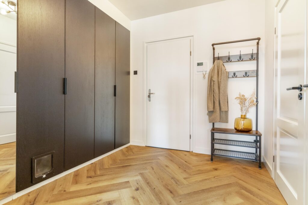 De hal verwelkomt je rustig en overzichtelijk, met op maat gemaakte kasten die alles netjes uit het zicht houden. Direct valt je oog op de glazen deur die je meteen uitnodigt in de lichte, ruime woonkeuken vol daglicht en luxe details.