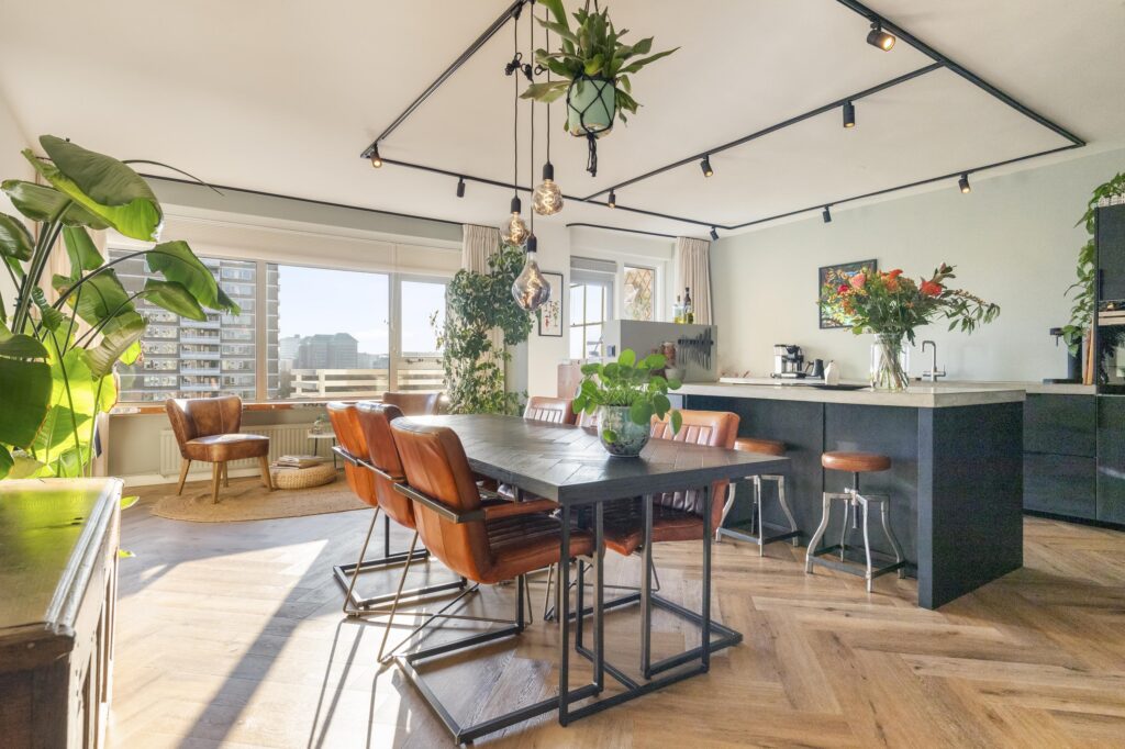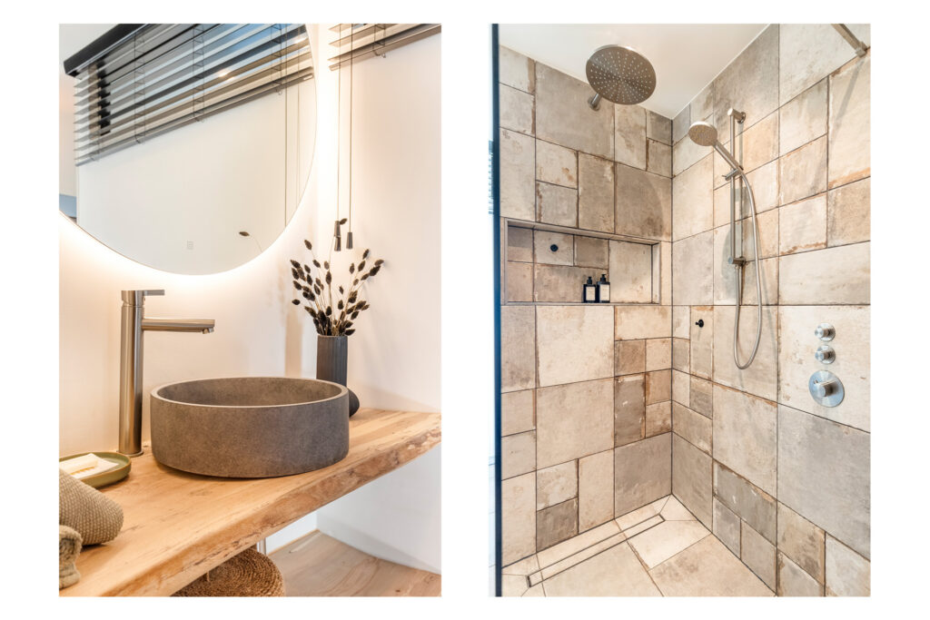 Industriële accenten, warme houttinten en rijke materialen geven de ruimte karakter zonder dat het druk aanvoelt. Alles klopt, alles ademt rust. De woning heeft op maat gemaakte stalen deuren en kasten met hout van oude spoorwegbielzen – een karaktervolle vintage touch die elegantie toevoegt.