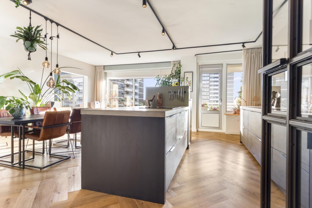 De keuken vormt een vanzelfsprekend verlengstuk van de leefruimte. Strak, modern en uitnodigend, met een functioneel kookeiland en voorzien van een op maat gemaakt betonnen keukenblad.