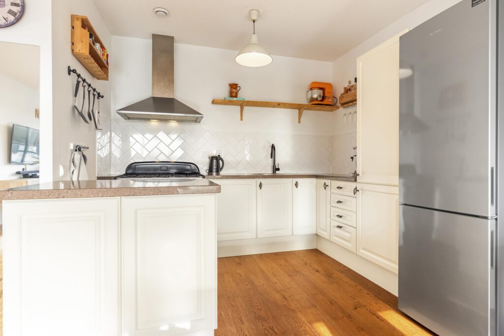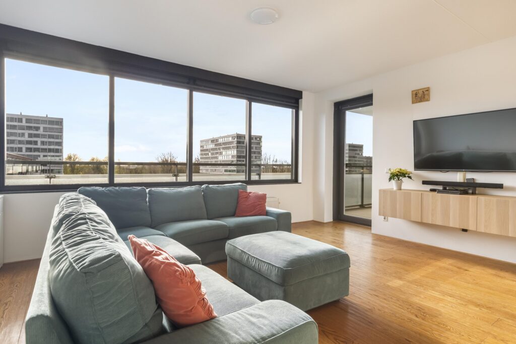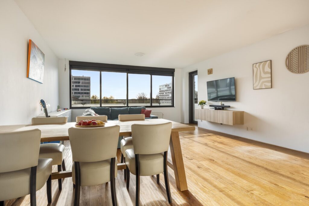 Wanneer je het appartement op de zesde verdieping binnenstapt, kom je eerst in een ruime hal die je direct toegang geeft tot de verschillende vertrekken. Loop je verder, dan opent de hal zich naar de royale en bijzonder lichte woonkamer. De grote ramen laten het daglicht volop binnenvallen en geven een vrij uitzicht over de omgeving. De woonkamer voelt warm en uitnodigend aan, met voldoende plek voor een grote zithoek waar je heerlijk kunt ontspannen. Aansluitend vind je het ruime eetgedeelte, perfect voor gezellige diners of lange avonden met vrienden. De ruimte loopt door in de open keuken, die een sfeervolle en landelijke uitstraling heeft. De keuken is uitgerust met een groot fornuis, veel werkruimte en praktische opbergruimte, een fijne plek voor kookliefhebbers.