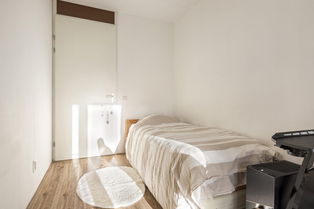 Vanuit de woonkamer loop je door naar de grote slaapkamer, een serene ruimte met veel licht en directe toegang tot het balkon. Met voldoende ruimte voor een royaal bed en kledingkast is dit een comfortabele plek om tot rust te komen. De tweede, kleinere slaapkamer, eveneens met toegang tot het balkon, is ideaal als werkruimte, logeerkamer of kinderkamer. De grote ramen en balkondeur zorgen hier voor een prettige, lichte sfeer.