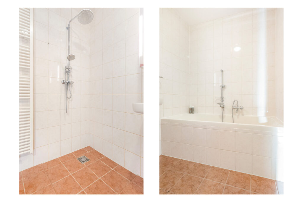De badkamer is slim ingedeeld en beschikt over zowel een ruime inloopdouche als een ligbad. De lichte betegeling zorgt voor een frisse uitstraling.