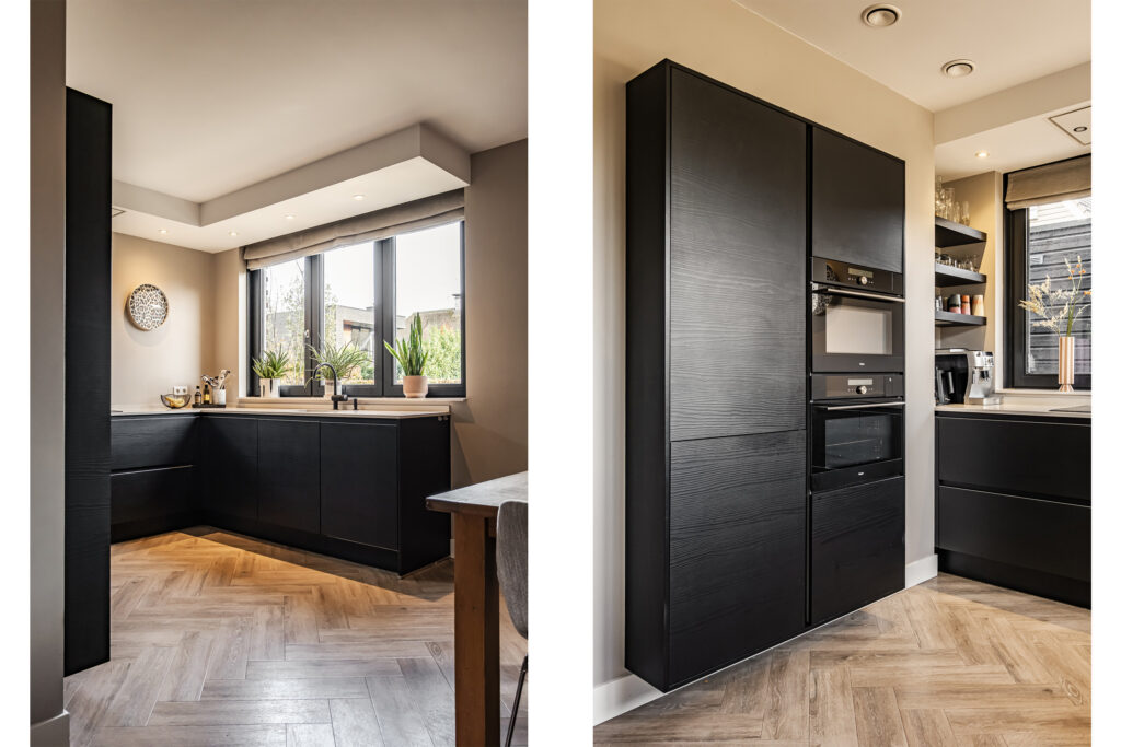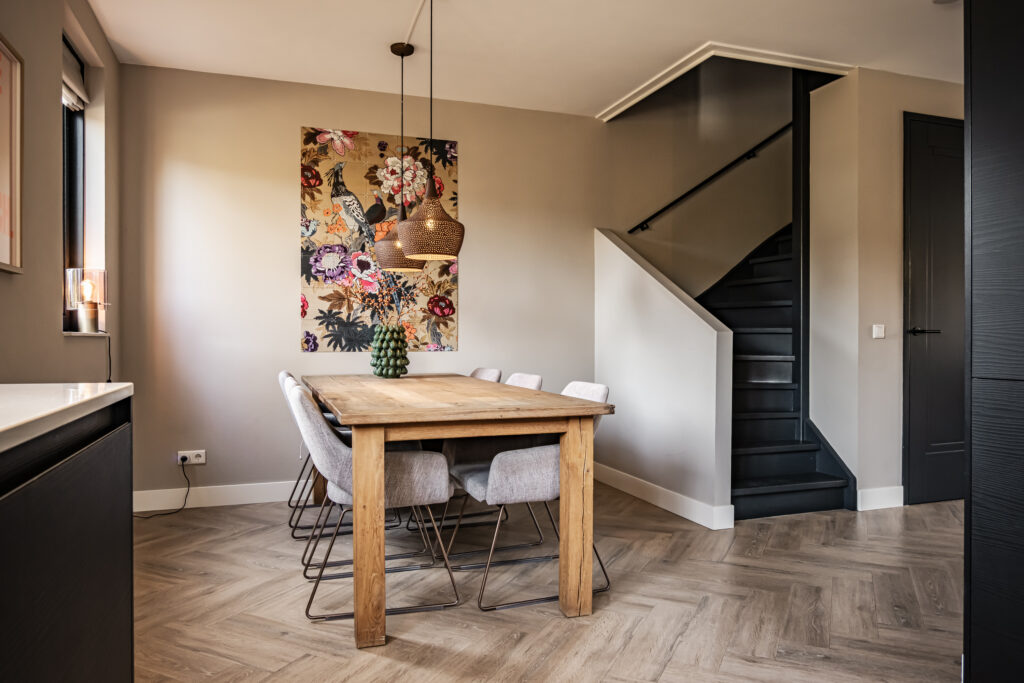 De zitkamer en eetkamer kunnen stijlvol van elkaar worden gescheiden door stalen ensuite deuren, die voor zowel sfeer als geluidsreductie zorgen. Aan de voorzijde ligt de gezellige eetkamer. De moderne keuken staat in open verbinding met deze ruimte, waardoor je tijdens het koken altijd betrokken blijft bij wat er aan tafel gebeurt. Vanuit de keuken heb je een vrij uitzicht naar buiten.