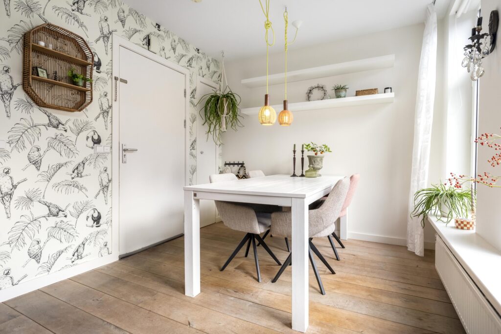 Bij binnenkomst in de eetkamer aan de voorzijde valt direct de prettige lichtinval en de open sfeer van de woning op. De woning heeft een praktische indeling waarbij elke ruimte optimaal wordt benut. De eetkamer, waar met gemak een royale eettafel geplaatst kan worden en waar dineren met familie of vrienden een vanzelfsprekende plek krijgt, sluit aan op de keuken.