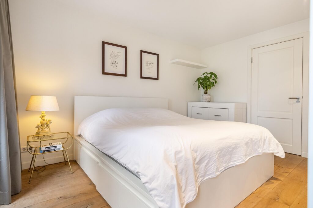 Vanuit de woonkamer leidt een vaste trap naar de bovenverdieping. Hier bevindt zich de tweede slaapkamer, een volwaardige en ruime kamer met voldoende plaats voor een tweepersoonsbed en een kledingkast. Aangrenzend ligt de badkamer, praktisch en stijlvol ingericht en voorzien van een inloopdouche, wastafel en wastafelmeubel. Samen vormen deze ruimtes een comfortabele en complete woonverdieping met een logische en prettige indeling.