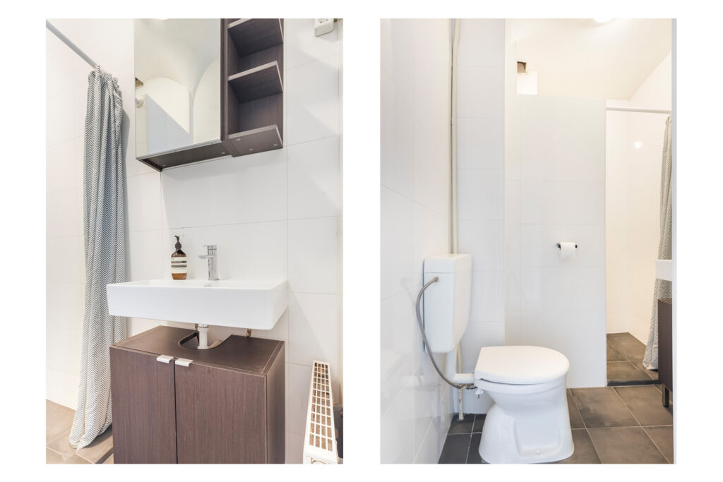 De badkamer is efficiënt ingedeeld en voorzien van een douche, wastafel en toilet. De indeling is praktisch, waardoor de ruimte optimaal en comfortabel wordt benut.