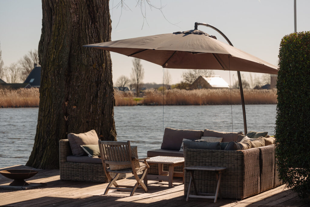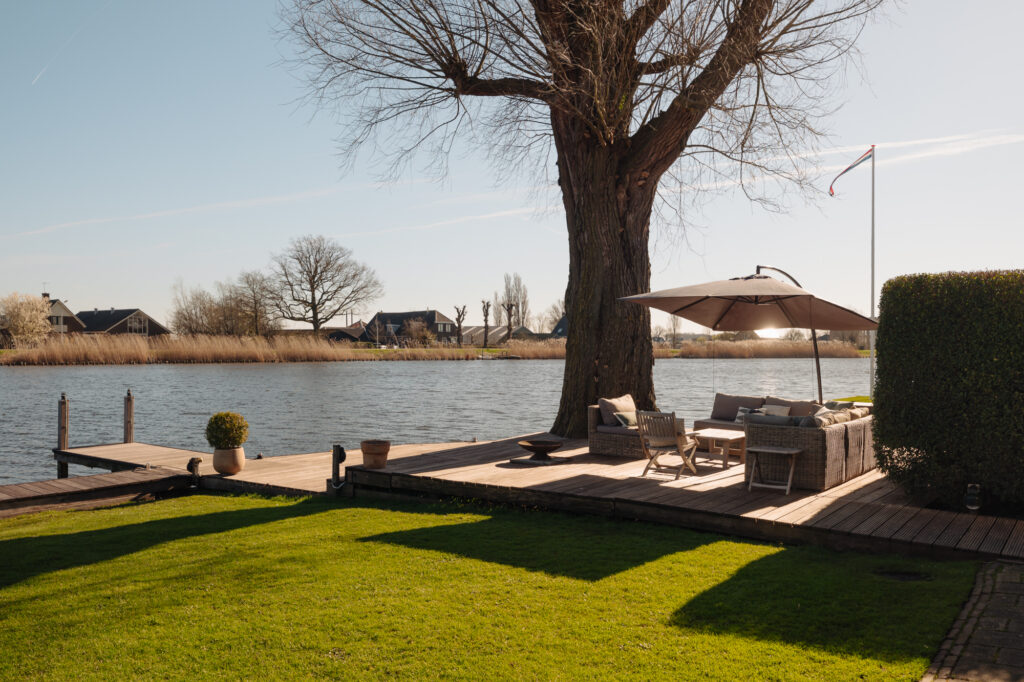 De royale tuin rondom de woning is één van de absolute pluspunten. Met meerdere terrassen, een eigen insteekhaven en aanlegsteigers biedt de tuin altijd een plek in de zon of schaduw. Of u nu wilt genieten van een rustige ochtend aan het water of een lange zomeravond met vrienden, hier kan het allemaal. Het perceel van circa 1.150 m² is met zorg onderhouden en verkeert in goede staat.