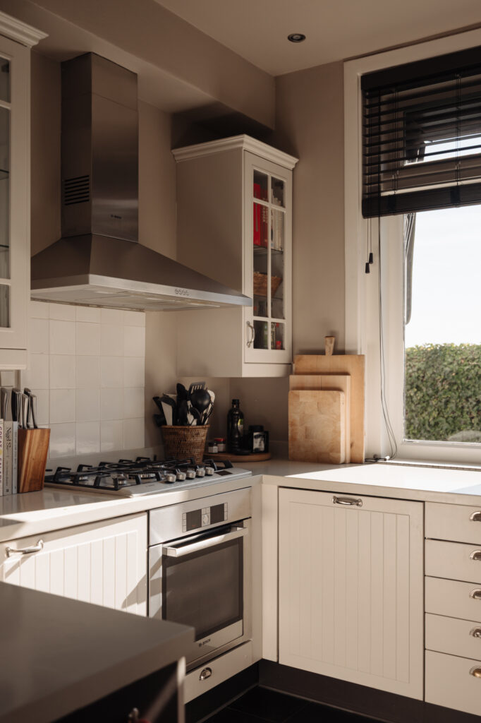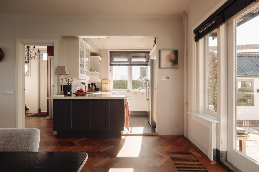 The entrance is reached via the beautifully landscaped and spacious front garden, enclosed by an electric gate and offering parking for several cars. You are sure to fall in love with this place at first sight. The rear of the house is directly on the River Vecht, with mooring space for a boat. The front door is located on the side of the house. Through this entrance, you enter the hallway with a toilet, cellar cupboard and staircase. From here, there is access to the bright living and dining room with semi-open kitchen. The space is lively, bright and well laid out, and thanks to the French doors opening onto the garden, there is a wonderful connection to the outdoor space. The living room, with its herringbone parquet floor, offers plenty of room for a comfortable sitting area and a cosy dining area. The kitchen is fitted with all modern conveniences, including a dishwasher, oven and fridge-freezer combination.